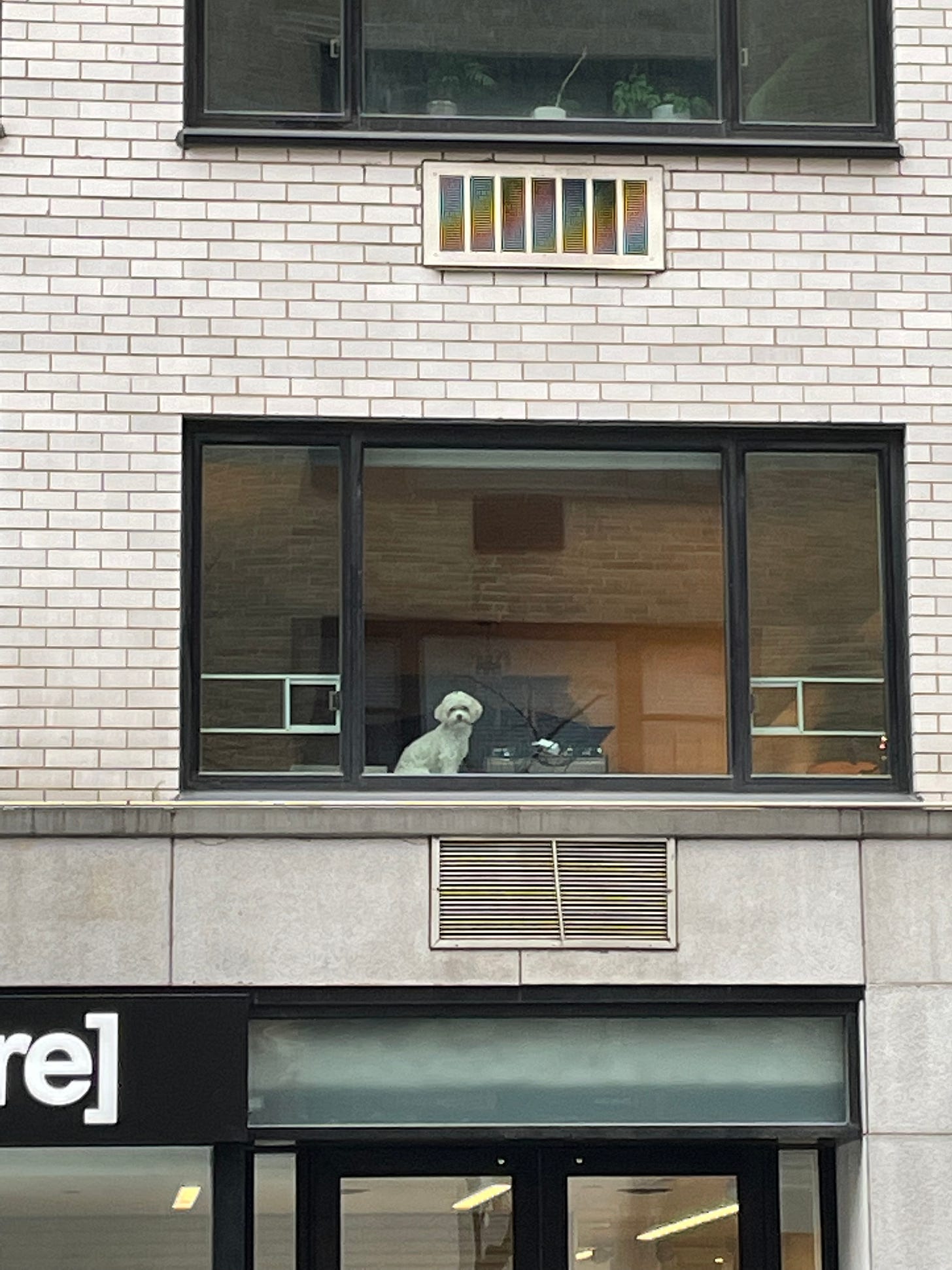This dog staring out his/her Upper East Side loft and saying hello
