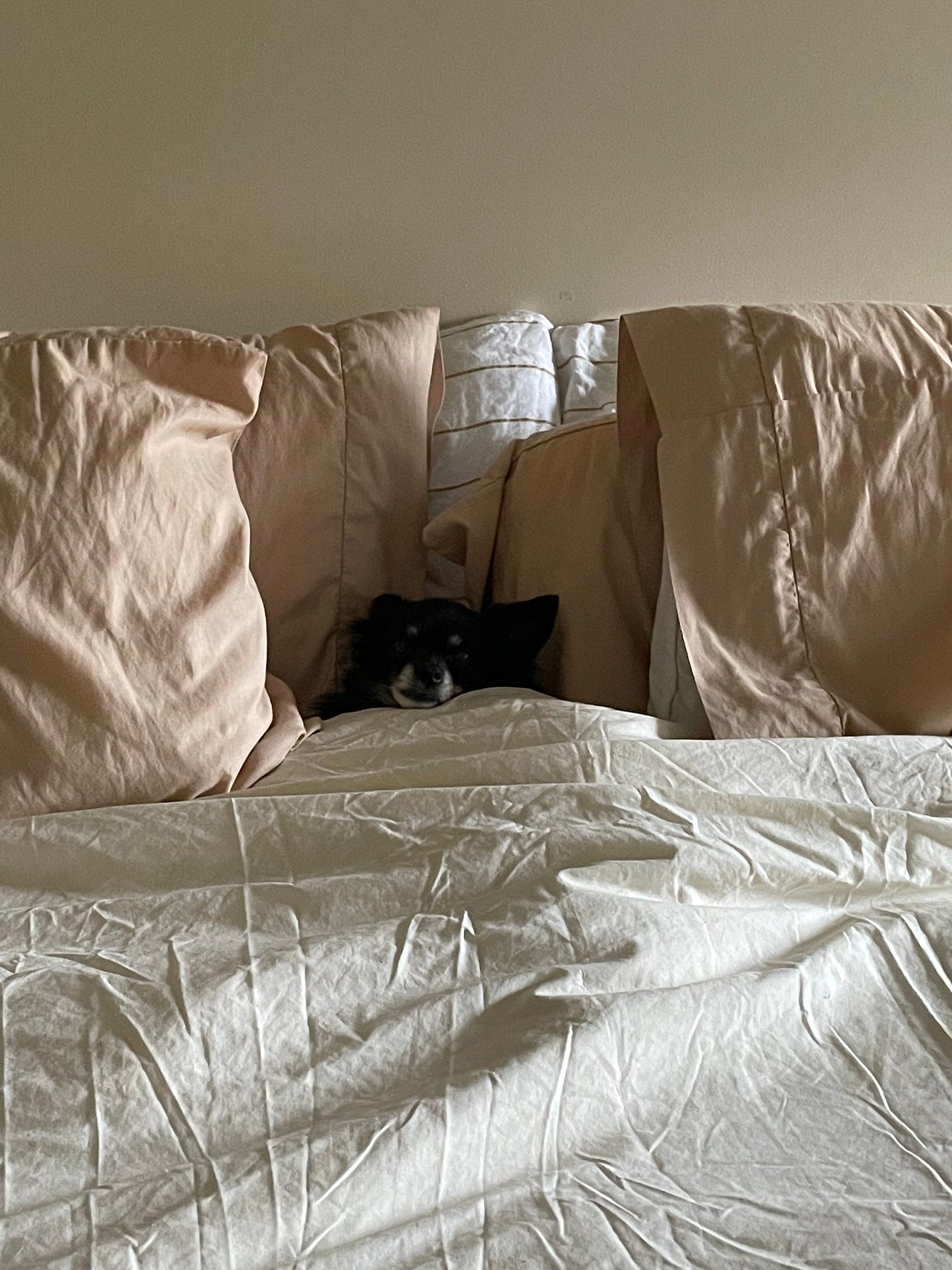 My friend’s pup refusing to move while I made the bed but made for a cute pic